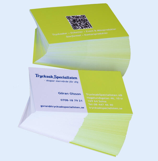 Med rätt grafisk form och ett bra pappersval kommer folk lättare ihåg just dig. Vi hjälper dig att göra dina korrespondens- och visitkort representativa för dig och ditt företag. Ett snyggt brevpapper (laserark) som följer din grafiska profil förhöjer helhetsintrycket av ditt företag. Vi ser till att tryck- och pappersval fungerar väl i din kontorsskrivare